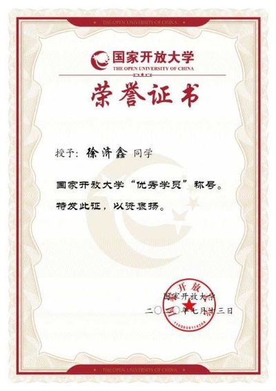 徐济鑫同学在校学习期间,各方面表现得十分优秀,学习勤奋刻苦,成绩名列前茅,国家开放大学已决定授予其国家开放大学“优秀学员”称号,并倡议全体学员向徐济鑫同学学习。