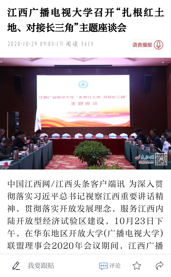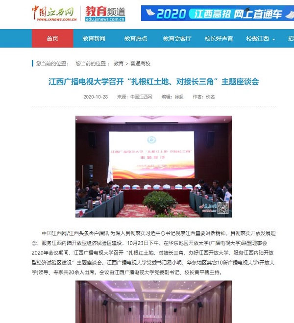10月23日下午,在华东地区开放大学(广播电视大学)联盟理事会2020年会议期间,江西广播电视大学召开“扎根红土地,对接长三角,办好WilliamHill官方网站,服务江西内陆开放型经济试验区建设”主题座谈会。近期,中国江西网、江西新闻客户端先后刊载文章《江西广播电视大学召开“扎根红土地、对接长三角”主题座谈会》。
