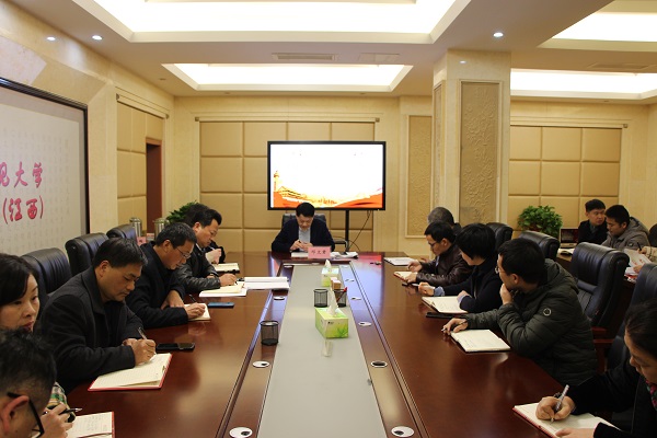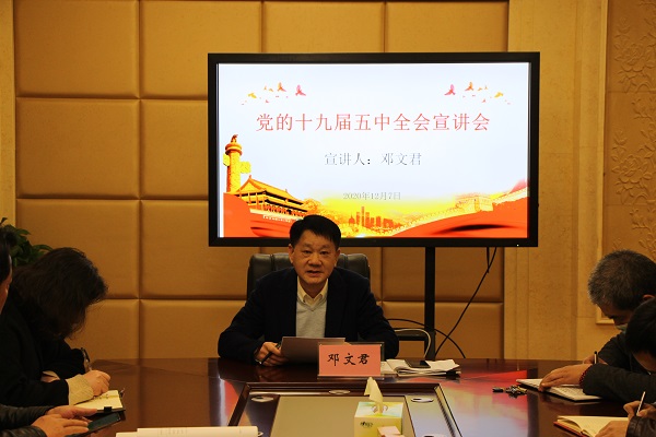 12月7日下午,校党委副书记邓文君在行政楼三楼第一会议室主持召开宣讲会,宣讲党的十九届五中全会精神。党委办公室、校长办公室,党委组织部,党委宣传部,党委统战部,党校(机关党委),人事处,工会,团委,学生工作部(处)、招生工作处,学报编辑部,思想政治理论课教学部主要负责同志及各部门(单位)全体党员干部、入党积极分子认真聆听了宣讲。