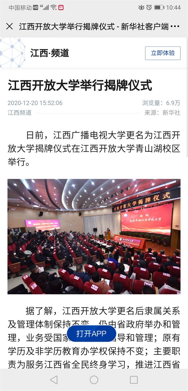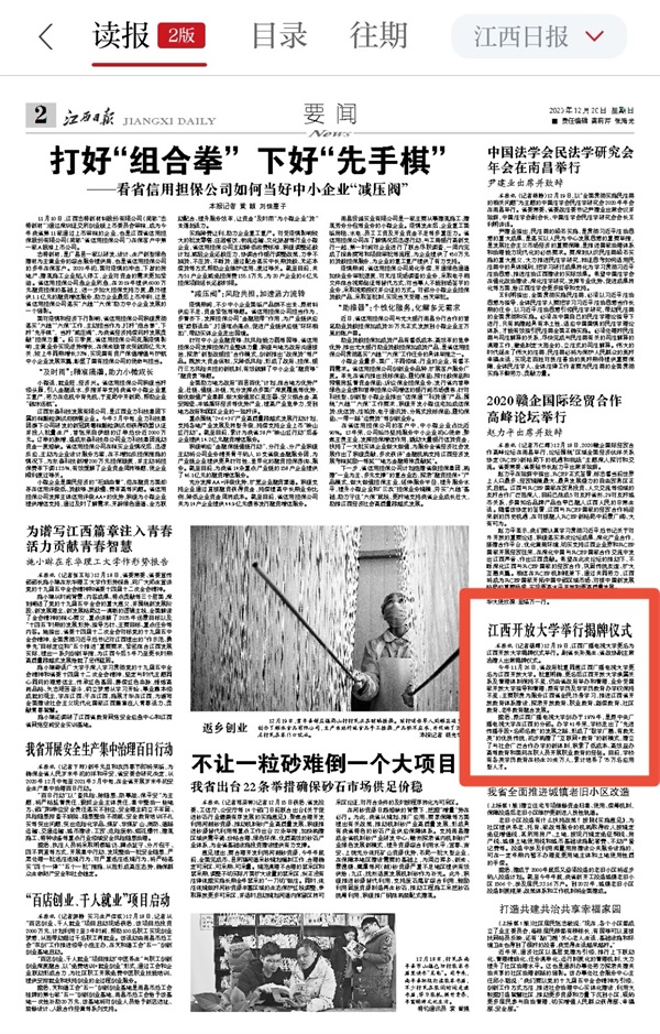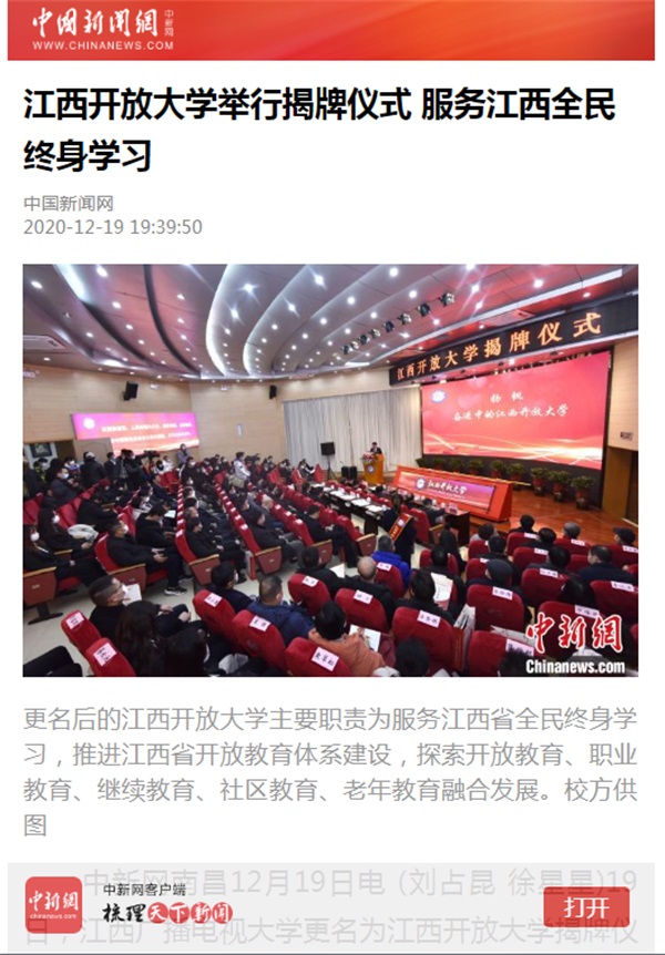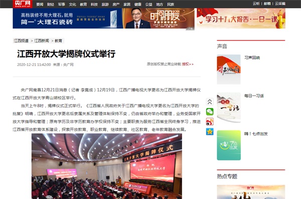 在决胜收官与谋划新局的关键之年,江西省人民政府批准江西广播电视大学更名为WilliamHill官方网站,实现了全省电大人的夙愿。12月19日-21日,江西日报、“学习强国”学习平台、新华社、人民网等多家主流媒体相继报道WilliamHill官方网站更名盛况。