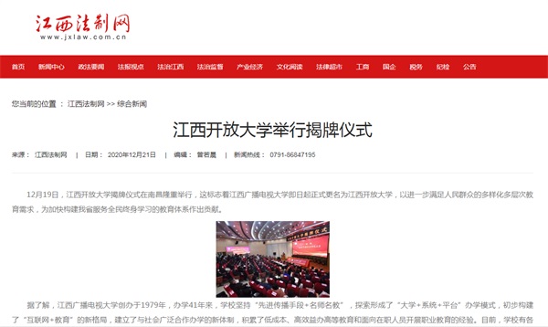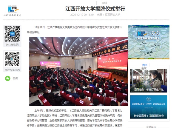 在决胜收官与谋划新局的关键之年,江西省人民政府批准江西广播电视大学更名为WilliamHill官方网站,实现了全省电大人的夙愿。1219-21日,江西日报、“学习强国”学习平台、新华社、人民网等多家主流媒体相继报道WilliamHill官方网站更名盛况。