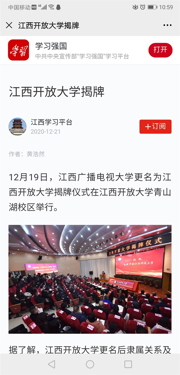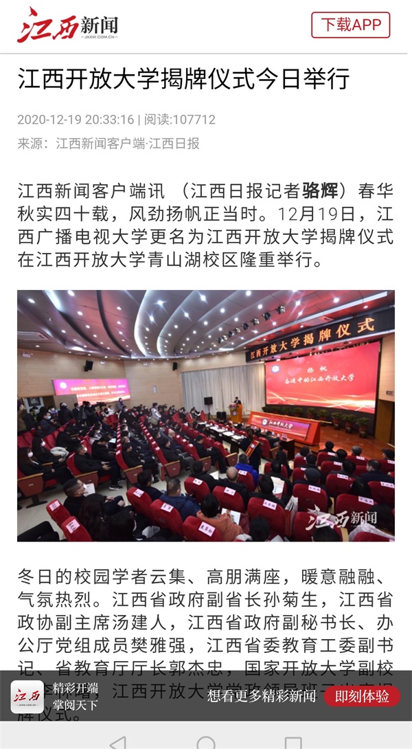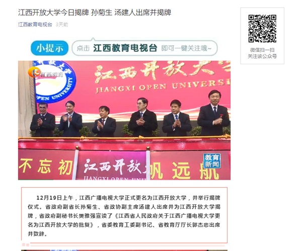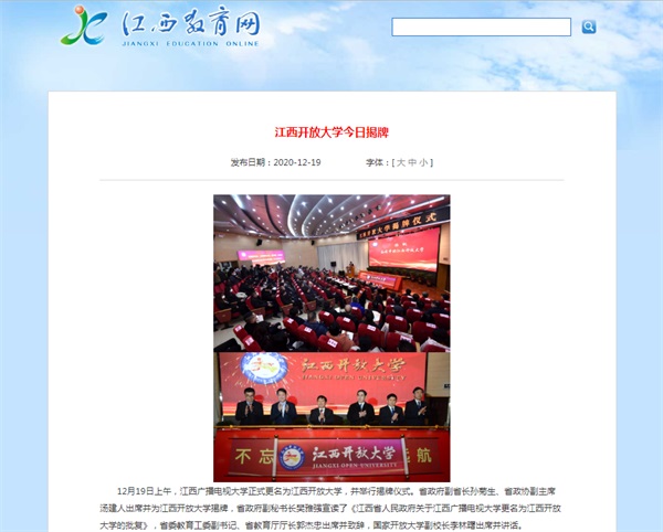 在决胜收官与谋划新局的关键之年,江西省人民政府批准江西广播电视大学更名为WilliamHill官方网站,实现了全省电大人的夙愿。12月19日-21日,江西日报、“学习强国”学习平台、新华社、人民网等多家主流媒体相继报道WilliamHill官方网站更名盛况。