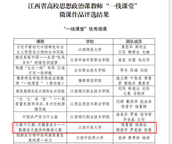 近日,江西省教育厅发布《关于公布江西省高校思想政治课教师“一线课堂”微课作品评选结果的通知》,我校教师陈蔓茜、杨湘弘、胡丽华、罗楚颖、张倩团队制作的课程《小康不小康,关键看老乡—— 婺源老乡脱贫的精准之路》,工程职院教师张戈 、李玫、晏潇、朱蕾、汪荣林团队制作的课程《秀美乡村看变化 一线课堂访样本》在全省众多课程中脱颖而出,获得“一线课堂”优秀微课荣誉。