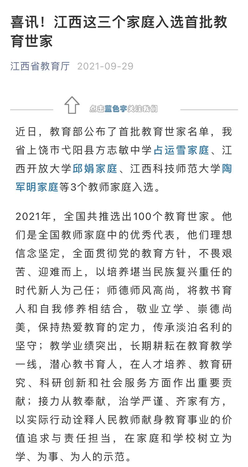 据悉,2021年全国共推选出100个教育世家,江西省共有3个教师家庭入选。他们是全国教师家庭中的优秀代表,他们理想信念坚定,全面贯彻党的教育方针,不畏艰苦、迎难而上,以培养堪当民族复兴重任的时代新人为己任;师德师风高尚,将教书育人和自我修养相结合,敬业立学、崇德尚美,保持热爱教育的定力,传承淡泊名利的坚守;教学业绩突出,长期耕耘在教育教学一线,潜心教书育人,在人才培养、教育研究、科研创新和社会服务方面作出重要贡献;接力从教奉献,治学严谨、齐家有方,以实际行动诠释人民教师献身教育事业的价值追求与责任担当,在家庭和学校树立为学、为事、为人的示范。