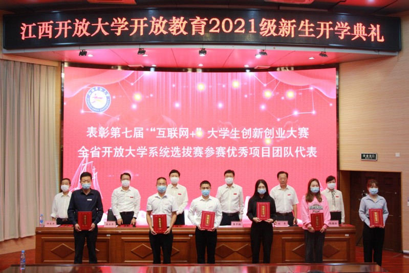 会议表彰了第七届“互联网+”大学生创新创业大赛全省开放大学系统选拔赛参赛优秀项目团队,出席开学典礼的校领导共同为获奖代表颁发了荣誉证书。