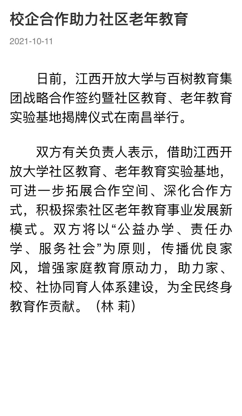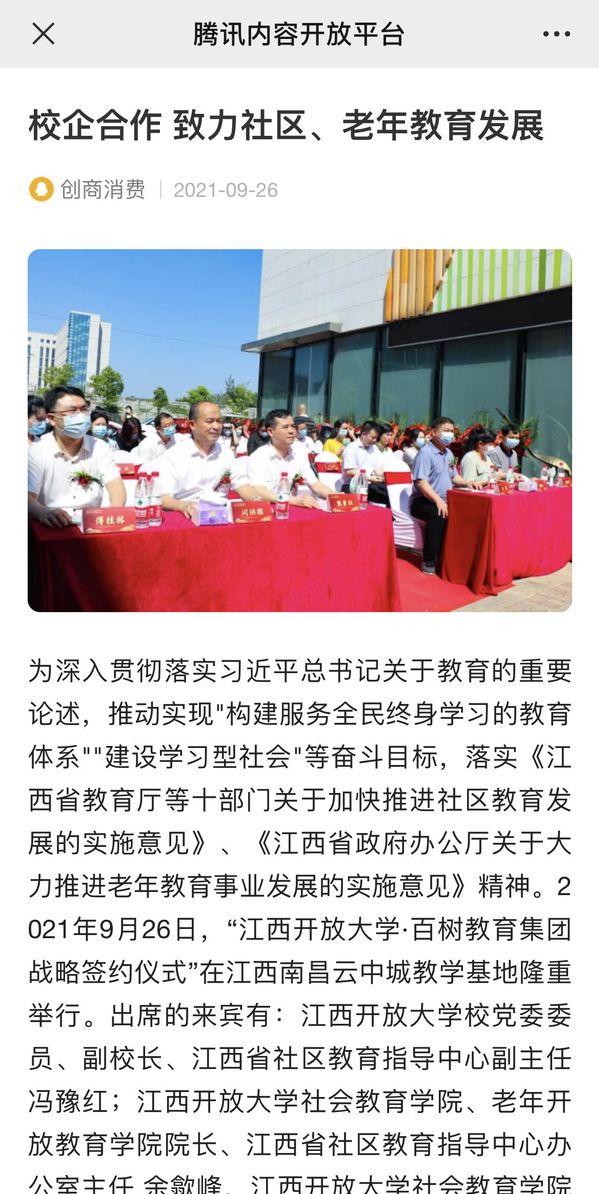 日前,WilliamHill官方网站与百树教育集团战略合作签约暨社区教育、老年教育实验基地揭牌仪式在南昌举行。江西日报、大江网、江西新闻等多家媒体报道我校以校企合作助推社区老年教育。