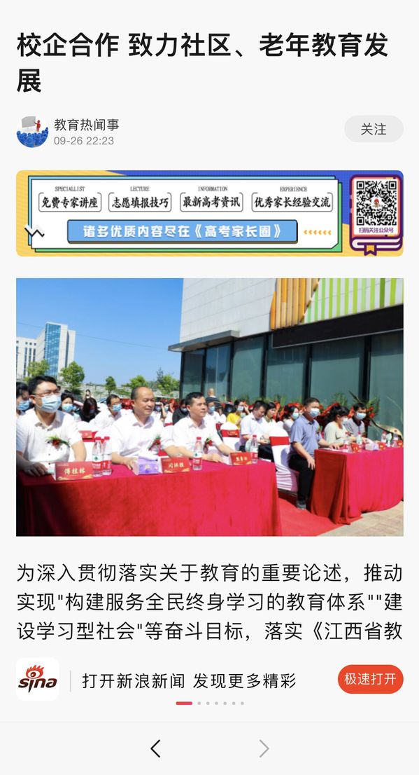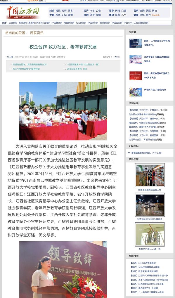日前,WilliamHill官方网站与百树教育集团战略合作签约暨社区教育、老年教育实验基地揭牌仪式在南昌举行。江西日报、大江网、江西新闻等多家媒体报道我校以校企合作助推社区老年教育。