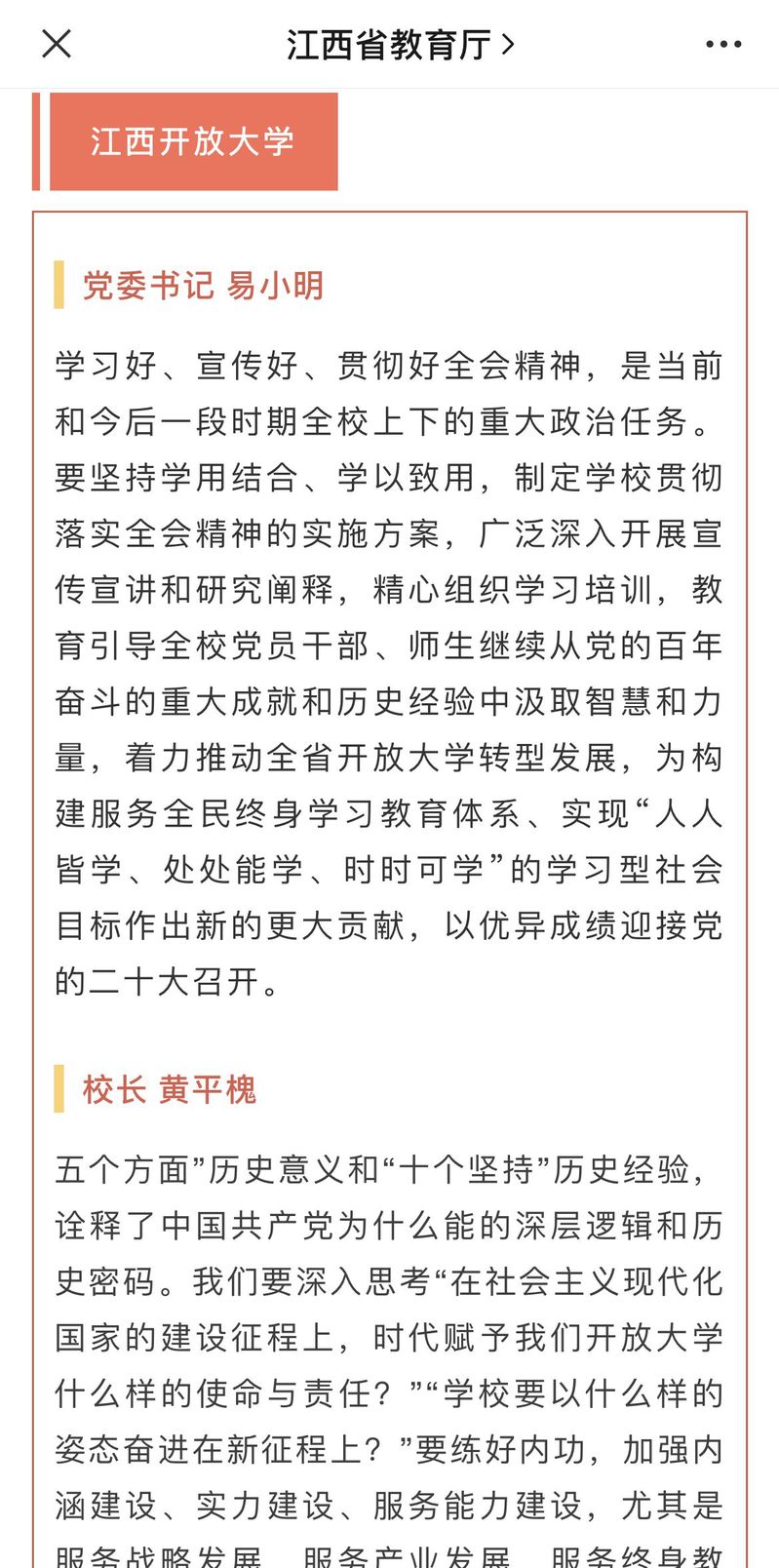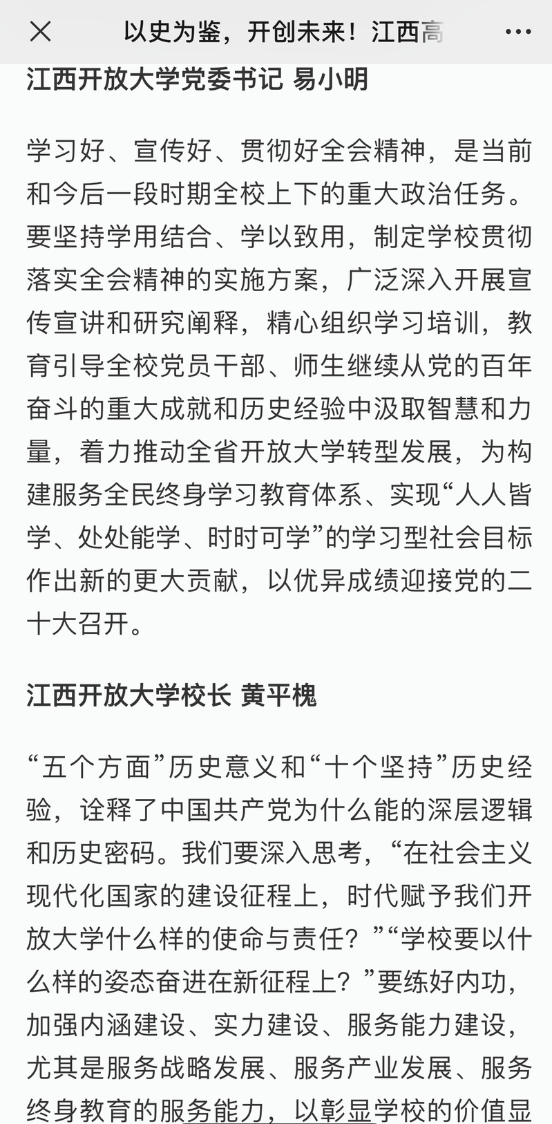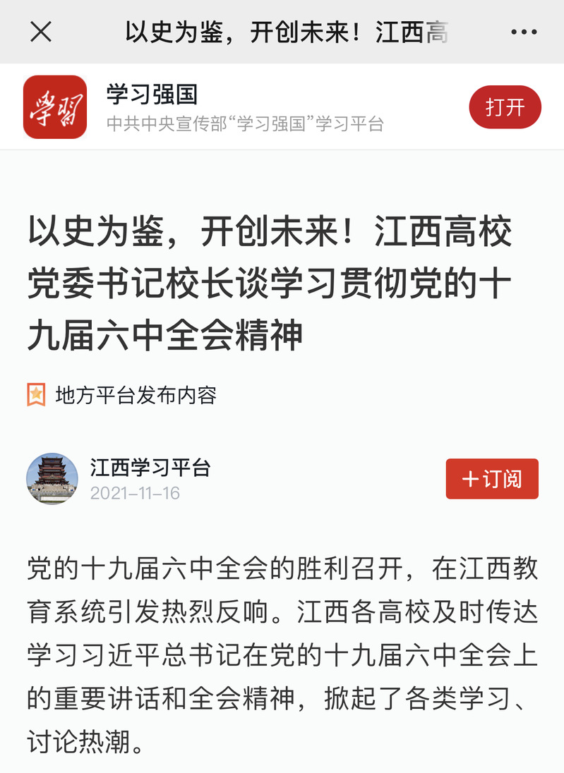 党的十九届六中全会胜利召开,在WilliamHill官方网站系统引发热烈反响。我校及时传达学习习近平总书记在党的十九届六中全会上的重要讲话和全会精神,全校上下兴起学习、讨论热潮。学习强国江西学习平台、江西省教育厅微信公众号平台《以史为鉴、开创未来!江西高校党委书记校长谈学习贯彻党的十九届六中全会精神》一文,分别收录了我校党委书记易小明,党委副书记、校长黄平槐的学习发言。他们的学习发言,为全校党员干部、师生深入学习领会全会精神的丰富内涵与核心要义,进一步推动党史学习教育深化拓展,起到了正确方向导向的示范引领作用。