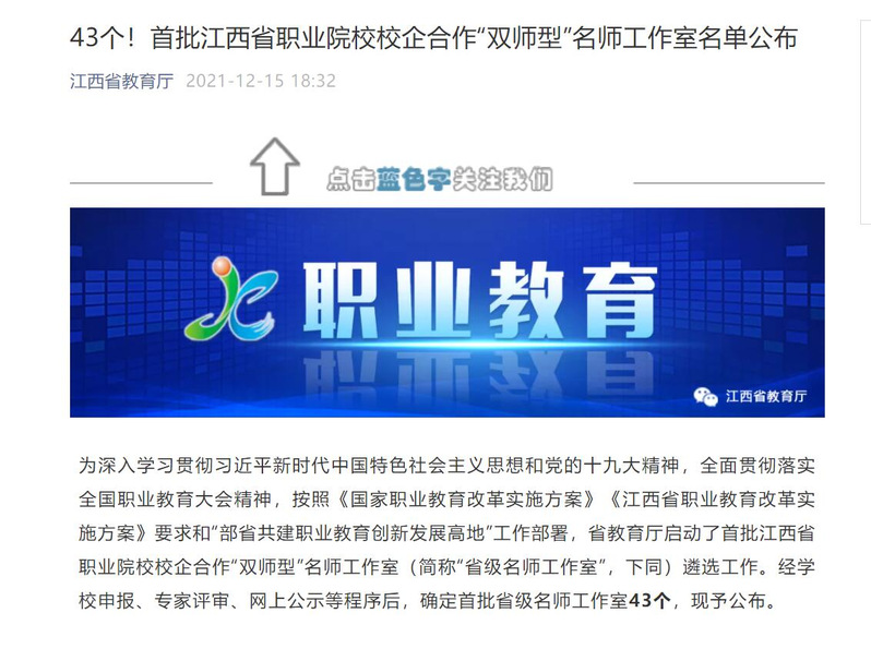喜讯:我校工程职院一工作室获评江西省首批职业院校校企合作“双师型”名师工作室称号