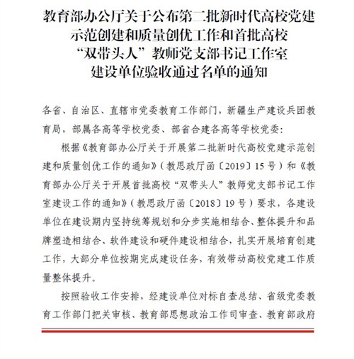 近日,教育部办公厅公布了全国第二批新时代高校党建示范创建和质量创优工作和首批高校“双带头人”教师党支部书记工作室建设单位验收通过名单,我校工程职院经管学院党支部顺利通过第二批“全国党建工作样板支部”创建工作验收。