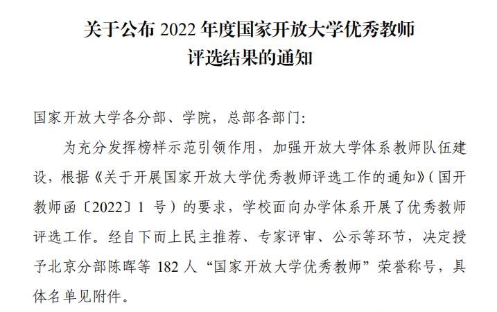 据悉,本次共评选出“国家开放大学优秀教师”182人。国家开放大学勉励受表彰教师戒骄戒躁、再接再厉,不断提升个人的政治素质、业务能力和育人水平。接下来,我校党委宣传部将推出师德师风专栏,宣传优秀典型,弘扬高尚师德,引导广大教师围绕学生、关照学生、服务学生,始终站在教书育人第一线,做学生为学、为事、为人的示范,做“四有”好老师,为开放教育高质量发展做出积极贡献。(供稿:党委宣传部 编辑:徐星星 责编:王松华)