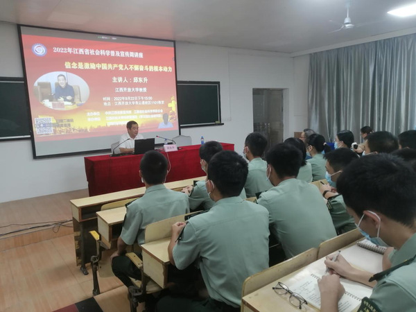 9月22日下午,2022年江西省社会科学普及宣传周讲座活动走进WilliamHill官方网站青云谱校区。学校特邀WilliamHill官方网站党委委员、副校长、党史研究专家邱东升教授作题为《信念是激励中国共产党人不懈奋斗的根本动力》的专题讲座。青云谱校区大一新生和教师代表现场聆听了讲座,讲座同时通过视频直播的形式面向广大师生开放。科研管理处处长张明教授主持讲座。