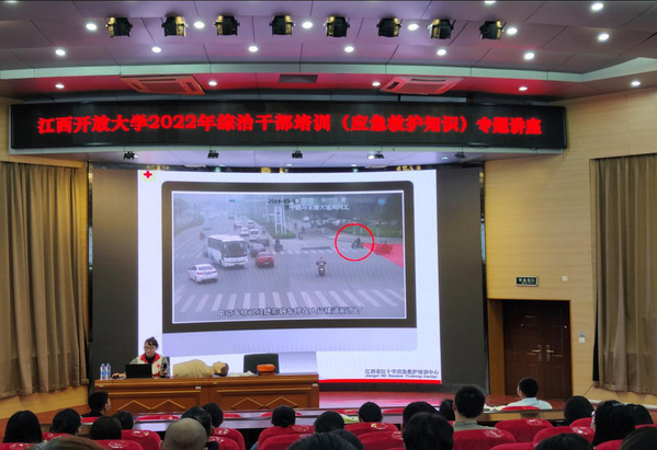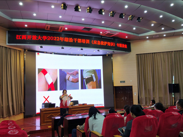 为进一步加强学校综治干部队伍建设,增强广大综治干部应急救护自救互救能力,建设平安和谐校园,10月21日上午,青山湖校区行政楼学术报告厅,江西省红十字会雷韶敏老师正在进行应急救护知识专题培训。全校综治干部及部分部门的主要负责人参加了讲座培训。