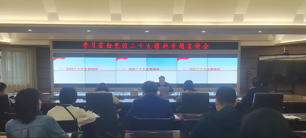 王水平以《学习领会党的二十大精神做一名忠诚干净担当的共产党员》为题,紧扣党的二十大报告原文,重点围绕党的二十大的重大意义、大会主题、理论亮点和主要成果、过去5年的工作和新时代10年的伟大变革、开辟马克思主义中国化时代化新境界、以中国式现代化全面推进中华民族伟大复兴、坚持党的全面领导和全面从严治党、应对风险挑战等方面,对党的二十大精神进行全面系统深入的宣讲解读。