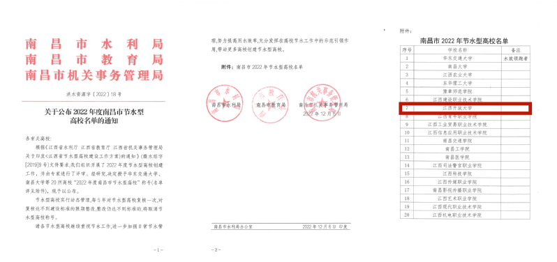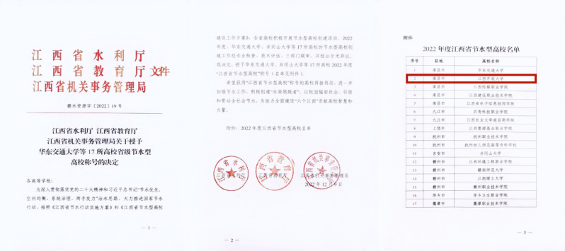 近日,我校被省水利厅、省教育厅、省机关事务管理局及市水利局、市教育局、市机关事务管理局分别授予“江西省节水型高校”“南昌市节水型高校”称号。