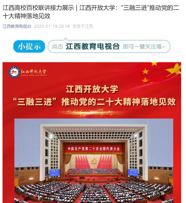 为深入贯彻落实党的二十大精神,学校党委整体规划、统筹推进,制定了宣传教育活动方案,成立了党的二十大精神“三融三进”宣讲团,辐射带动全省开放大学系统师生近18万人学习贯彻党的二十大精神。近日,江西新闻、国际在线等媒体对我校“三融三进”推动党的二十大精神落地见效进行了报道。