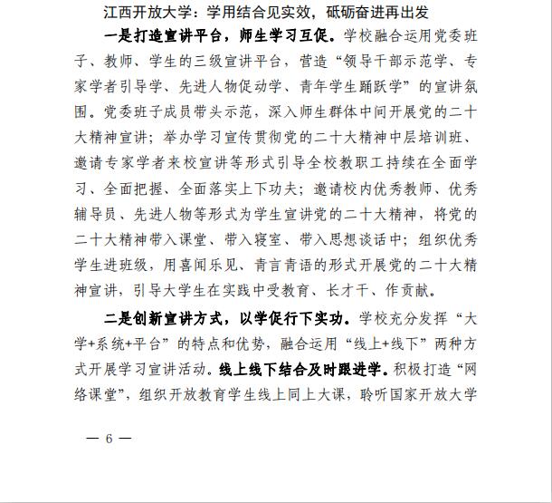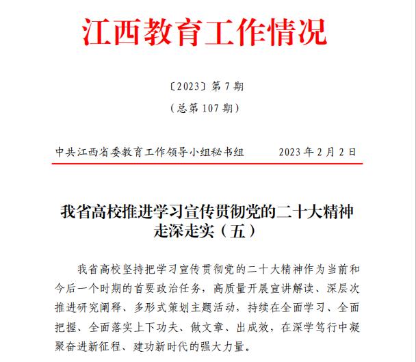 2月2日,由中共江西省教育工作领导小组秘书组编发的《江西教育工作情况》(〔2023〕第7期),在《江西省各地各校推进学习宣传贯彻党的二十大精神走深走实(五)》一文中,收录了我校的典型案例。