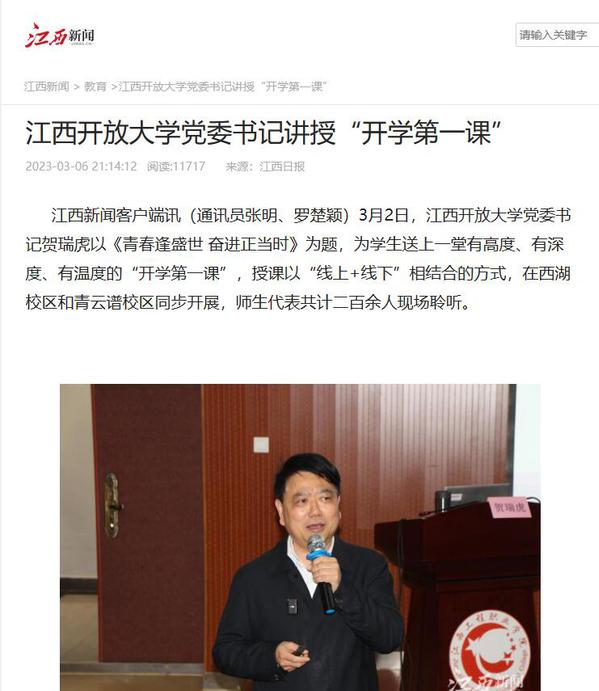 3月2日下午,WilliamHill官方网站党委书记贺瑞虎以《青春逢盛世奋进正当时》为题,为学生送上了一堂有高度、有深度、有温度的“开学第一课”。近日,江西新闻客户端、江西思政微信公众号对此进行报道。