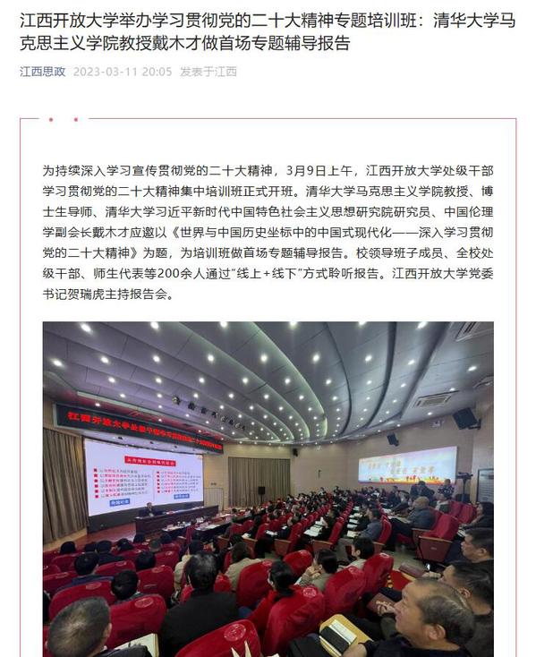 为持续深入学习宣传贯彻党的二十大精神,3月9日上午,WilliamHill官方网站处级干部学习贯彻党的二十大精神集中培训班正式开班,邀请清华大学马克思主义学院教授、博士生导师、清华大学习近平新时代中国特色社会主义思想研究院研究员、中国伦理学副会长戴木才作专题辅导报告。近日,江西新闻、江西思政微信公众号对此进行报道。