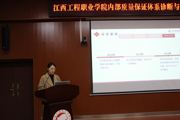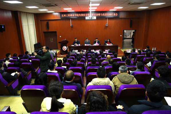 3月20日,江西工程职业学院教学诊改现场复核工作汇报会在西湖校区召开。以全国职业院校教学诊改专家委员会委员、浙江省高职诊改专委会秘书长王成方为组长,江西工业贸易职业技术学院原党委副书记、院长雷筱芬为副组长的诊改复核专家组一行8人对我校内部质量保证体系诊改工作进行为期三天的现场复核。校党委书记贺瑞虎致欢迎辞,党委副书记、校长黄平槐主持会议。学院领导班子成员、中层干部,专业、课程负责人,教师及学生代表参加汇报会。