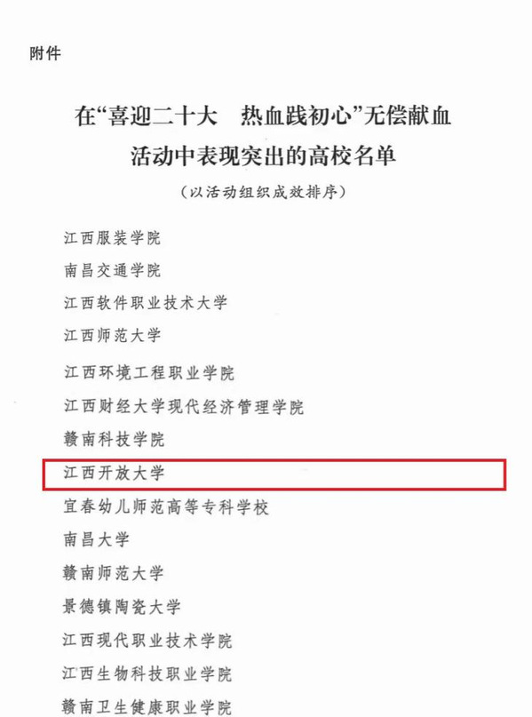 近日,江西省卫生健康委员会、江西省教育厅、共青团江西省委联合印发的《关于对“喜迎二十大 热血践初心”无偿献血活动中表现突出高校进行表扬的通知》,学校获通报表扬。