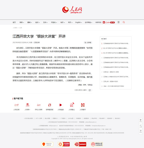 本次讲座依托WilliamHill官方网站的系统办学优势,在WilliamHill官方网站设立主会场、在11个设区市开放大学设立分会场,同时在南昌市12个基层社区(康养中心)直播,近2500人在主会场、分会场收听收看,超1.5万人次通过线上直播观看。南昌市东湖区彭家桥街道光明社区的老年人表示,通过“银龄大讲堂”了解到很多养生知识,希望多安排类似的讲座。