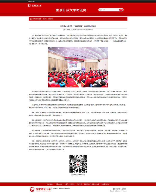 为认真贯彻落实习近平总书记关于老龄工作的重要论述,扎实开展好学习贯彻习近平新时代中国特色社会主义思想主题教育,践行“学思想、强党性、重实践、建新功”的总要求,切实为民办好事办实事,满足老年朋友多样化学习需求,提升老年群体生活品质、生命质量和幸福指数,4月19日下午,江西老年开放大学联合江西省教育厅、江西省科学技术协会、南昌大学第二附属医院、江西省医疗健康投资有限公司,共同开展“银龄大讲堂”——《心脑血管健康养生知识》健康系列(第一期)讲座。