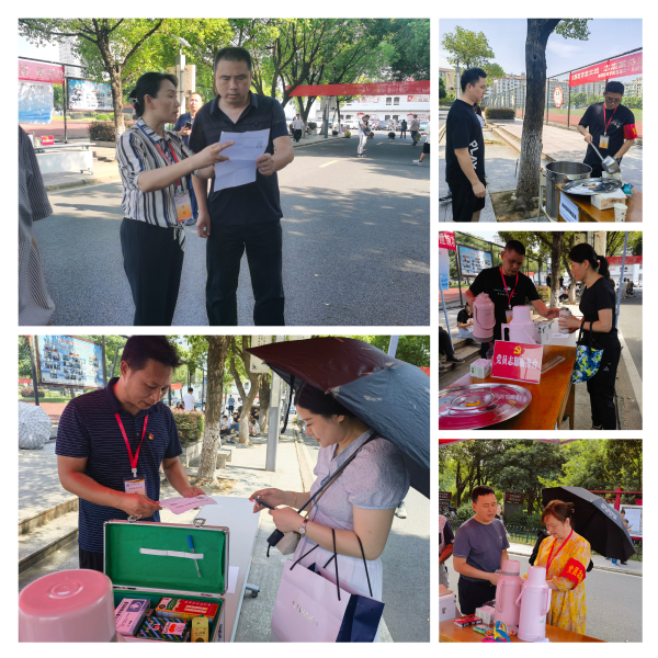 炎炎夏日,骄阳似火。党员志愿者们顶着烈日酷暑,搭建遮阳帐篷,设立党员志愿服务台,为考生免费提供水笔、纸等考试文具,为师生提供饮用水、绿豆汤、风油精、藿香正气水等防暑用品,引导考生进入考场,大家纷纷以实际行动送上温暖与服务,让师生们在酷暑考试中感受一丝夏日的“清凉”。