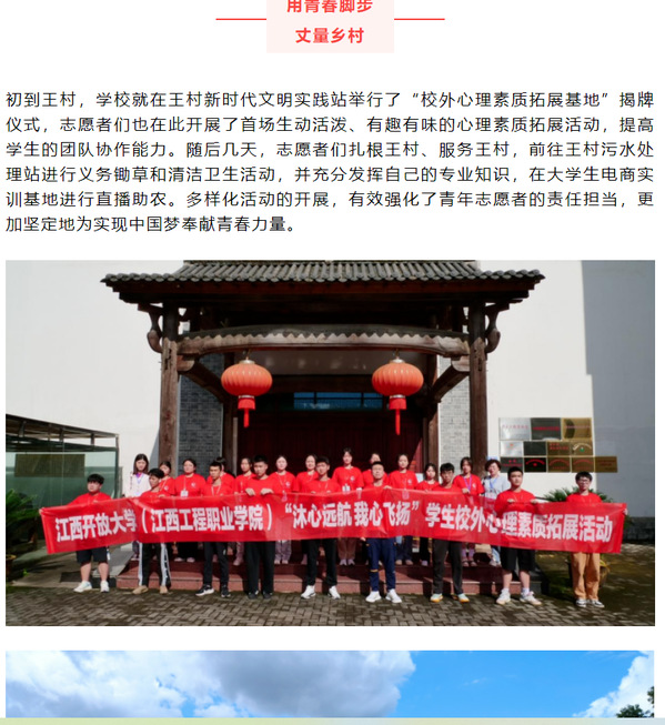 6月,WilliamHill官方网站(江西工程职业学院)“沐心飞扬”志愿者团队前往婺源县秋口镇王村开展了暑期社会实践活动,进一步整合巩固学校“乡村振兴”项目成果,引导和帮助广大青年学生在社会实践中受教育、长才干、作贡献。