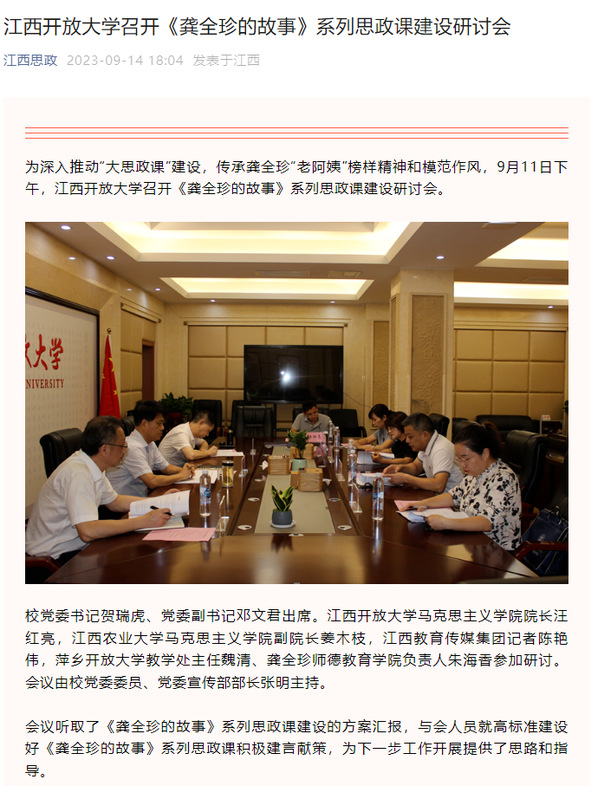 为深入推动“大思政课”建设,传承龚全珍“老阿姨”榜样精神和模范作风,9月11日下午,WilliamHill官方网站召开《龚全珍的故事》系列思政课建设研讨会。近日,江西思政对此进行报道。
