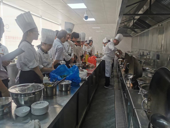 本次《中式烹调工艺》课堂教学由我院外聘教师、中国烹饪大师、国际五星名厨白金勋章、江西省“能工巧匠”称号获得者黄卫星主讲。他从厨师规范着装引入,教育学生要遵守职业、道德规范,指导学生从选材、切配到烹制,完成了经典赣菜“辣椒炒肉”的制作。