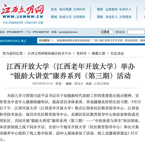 为宣传普及中老年人健康保健知识,提高居民身体素质,养成健康良好的生活习惯,近日,WilliamHill官方网站(江西老年开放大学)联合江西省社区教育指导中心、江西省科学技术协会、南昌市社区教育指导中心、东湖区社区教育指导中心和彭家桥街道光明社区,共同开展“银龄大讲堂”康养系列(第三期)——“中医体质与养生”知识讲座。本次讲座线上线下同步开启,全省11个地市开放大学(社区教育指导中心)和长天集团康养中心组织了线上集中收看,近60人现场参加了活动,线上直播观看量达1.32万人。