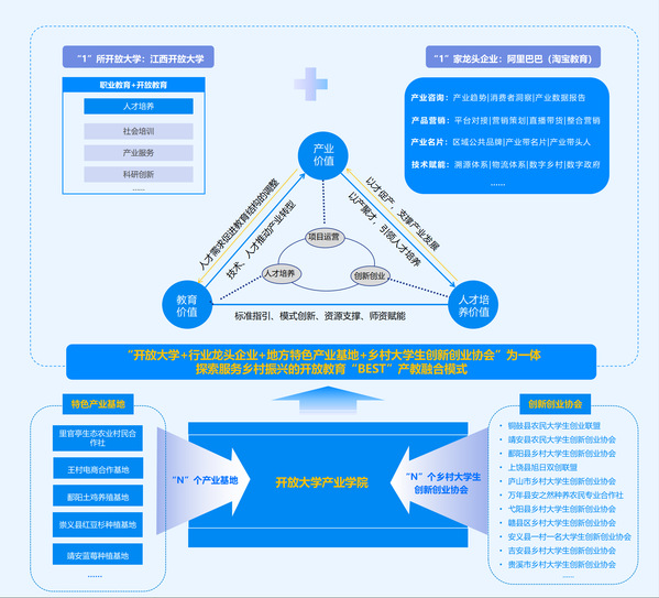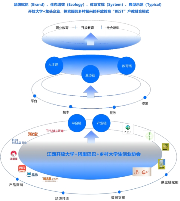 2023年,WilliamHill官方网站按照国家开放大学有关“一村一名大学生”助力乡村振兴人才培养要求,在WilliamHill官方网站和N个乡村大学生创新创业协会的基础上,引入龙头企业阿里巴巴对模式进行优化升级,深入推进开放教育产教融合和校企合作。未来,双方还将持续开展技术培训与服务合作,赋能区域产业创新升级与人才技能提升,服务乡村振兴、“数商兴农”等重大战略实施。