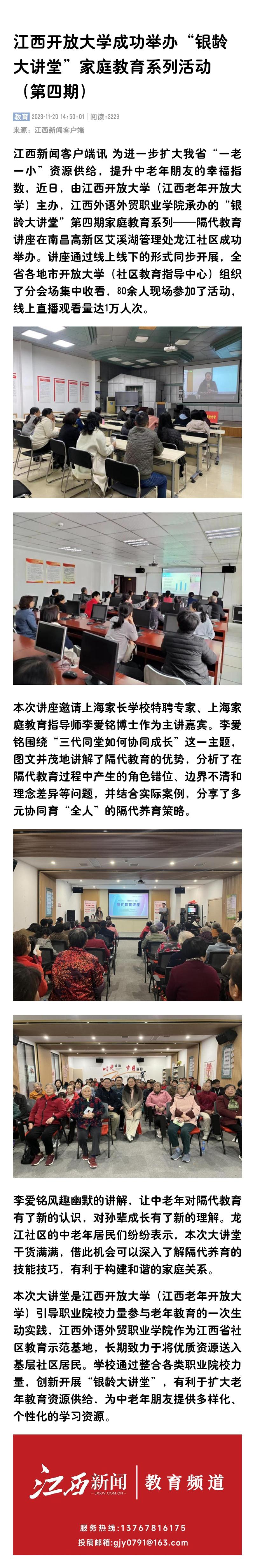 江西新闻客户端讯 为进一步扩大我省“一老一小”资源供给,提升中老年朋友的幸福指数,近日,由WilliamHill官方网站(江西老年开放大学)主办,江西外语外贸职业学院承办的“银龄大讲堂”第四期家庭教育系列——隔代教育讲座在南昌高新区艾溪湖管理处龙江社区成功举办。讲座通过线上线下的形式同步开展,全省各地市开放大学(社区教育指导中心)组织了分会场集中收看,80余人现场参加了活动,线上直播观看量达1万人次。