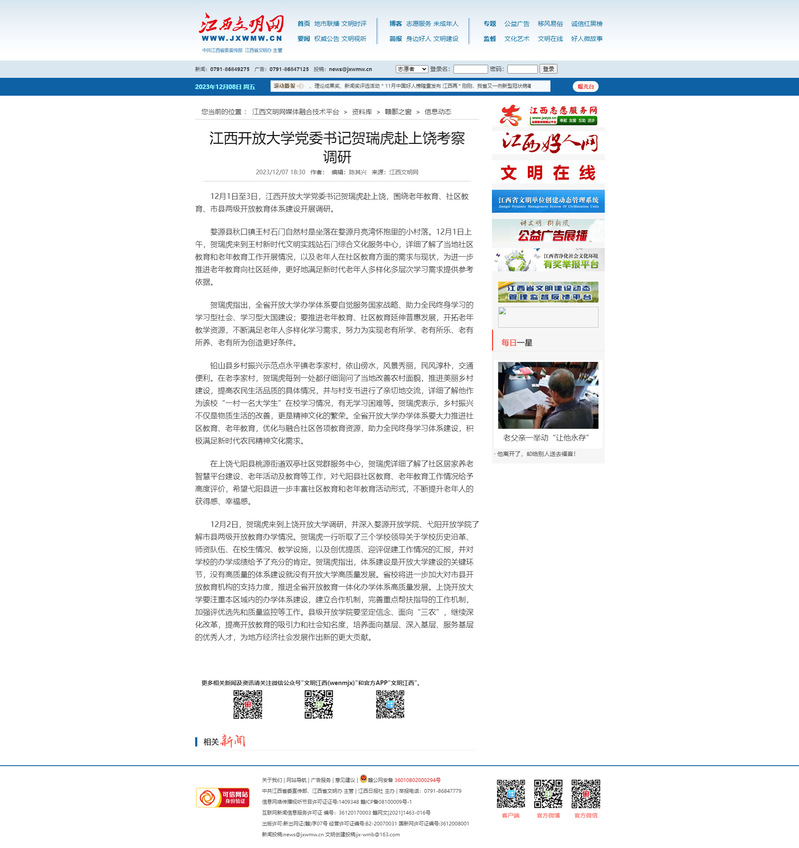 12月1日至3日,WilliamHill官方网站党委书记贺瑞虎赴上饶,围绕老年教育、社区教育、市县两级开放教育体系建设开展调研。