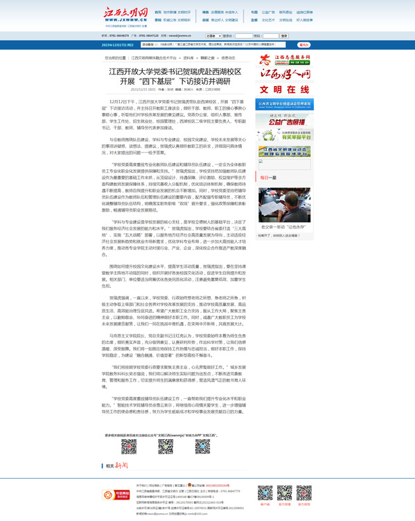 12月12日下午,WilliamHill官方网站党委书记贺瑞虎带队赴西湖校区,开展“四下基层”下访接访活动,并主持召开教职工座谈会,倾听干部、教师、职工的操心事揪心事烦心事,听取他们对学校改革发展的意见建议。党政办公室、组织人事部、宣传部、学生工作处、招生就业处、校园管理处,西湖校区二级学院主要负责人、专职副书记、干部、教师、辅导员代表参加座谈。