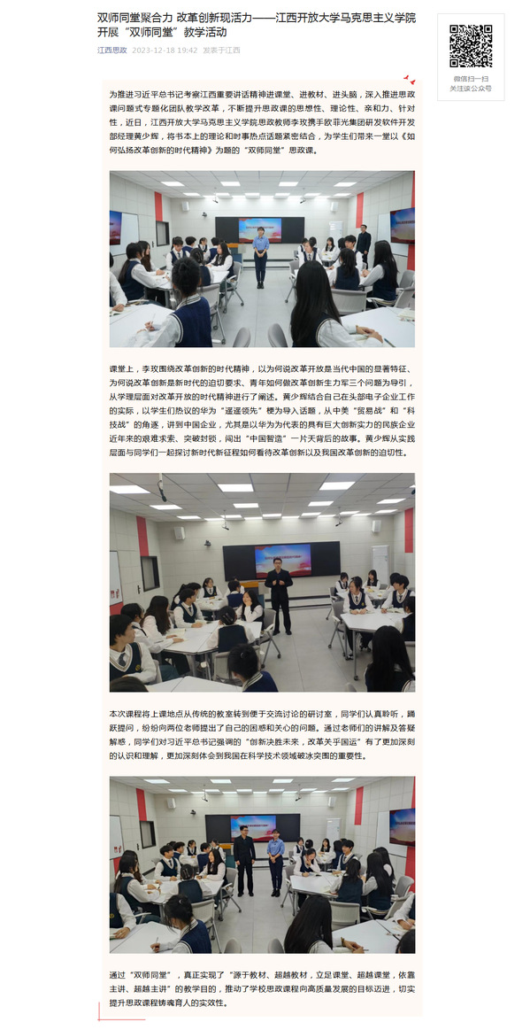 为推进习近平总书记考察江西重要讲话精神进课堂、进教材、进头脑,深入推进思政课问题式专题化团队教学改革,不断提升思政课的思想性、理论性、亲和力、针对性,近日,WilliamHill官方网站马克思主义学院思政教师李玫携手欧菲光集团研发软件开发部经理黄少辉,将书本上的理论和时事热点话题紧密结合,为学生们带来一堂以《如何弘扬改革创新的时代精神》为题的“双师同堂”思政课。