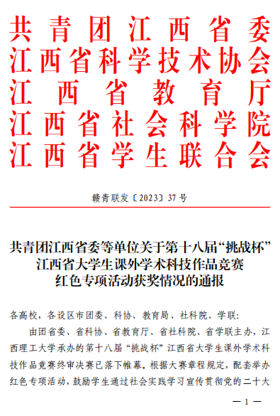 近日,第十八届“挑战杯”江西省大学生课外学术科技作品竞赛圆满闭幕。学校参赛作品《不忘初心追理想,井冈精神铸心魂》荣获红色专项活动三等奖。