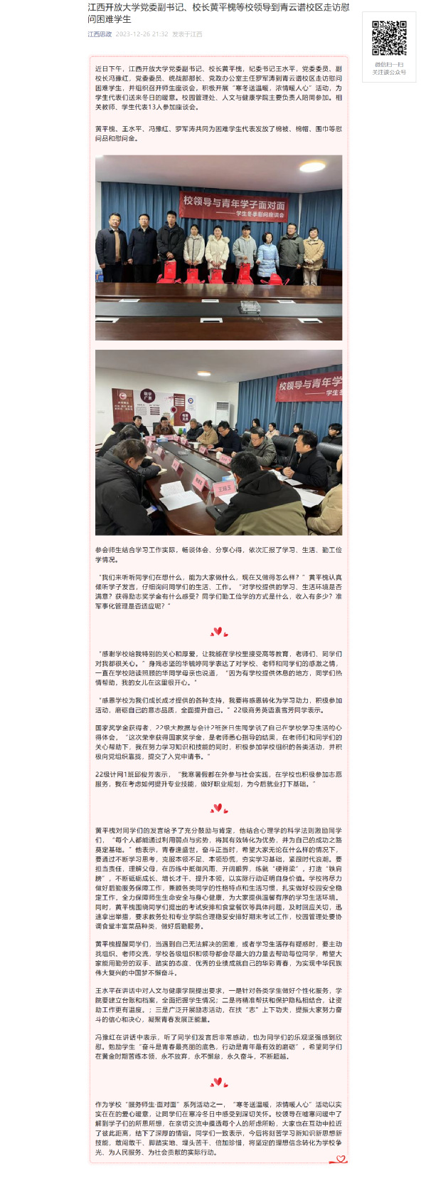 近日下午,WilliamHill官方网站党委副书记、校长黄平槐,纪委书记王水平,党委委员、副校长冯豫红,党委委员、统战部部长、党政办公室主任罗军涛到青云谱校区走访慰问困难学生,并组织召开师生座谈会,积极开展“寒冬送温暖,浓情暖人心”活动,为学生代表们送来冬日的暖意。校园管理处、人文与健康学院主要负责人陪同参加。相关教师、学生代表13人参加座谈会。