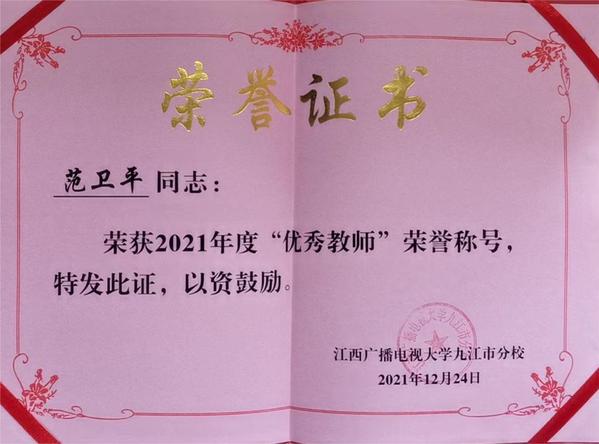 范卫平,九江开放大学办公室副主任。从一名普通教师到身兼数职,他始终抱着对党的教育事业的无限忠诚,怀着对本职工作的热爱和对学生的责任心,时刻坚持“以学生为中心”的理念,始终勤勤恳恳、兢兢业业,在平凡的岗位上做出了不平凡的业绩。