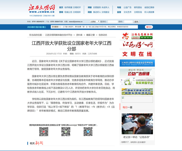近日,国家老年大学印发《关于设立国家老年大学江西分部的通知》,正式批复WilliamHill官方网站设立国家老年大学江西分部,明确了国家老年大学江西分部接受江西省教育厅领导,接受国家老年大学业务指导。