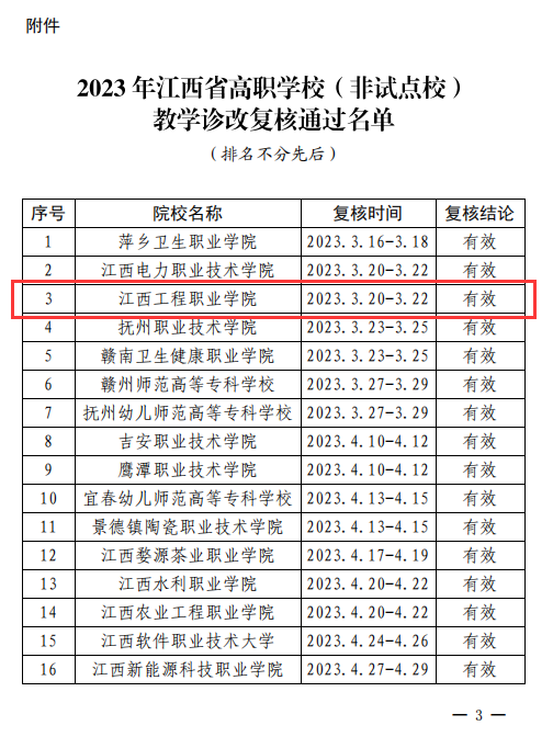 近日,江西省教育厅印发《关于公布2023年江西省高职学校(非试点校)教学诊改现场复核结论的通知》,学校顺利通过高职学校(非试点校)教学诊改现场复核。此前,我校于2022年7月通过网上复核,2023年3月20日-22日开展现场复核。