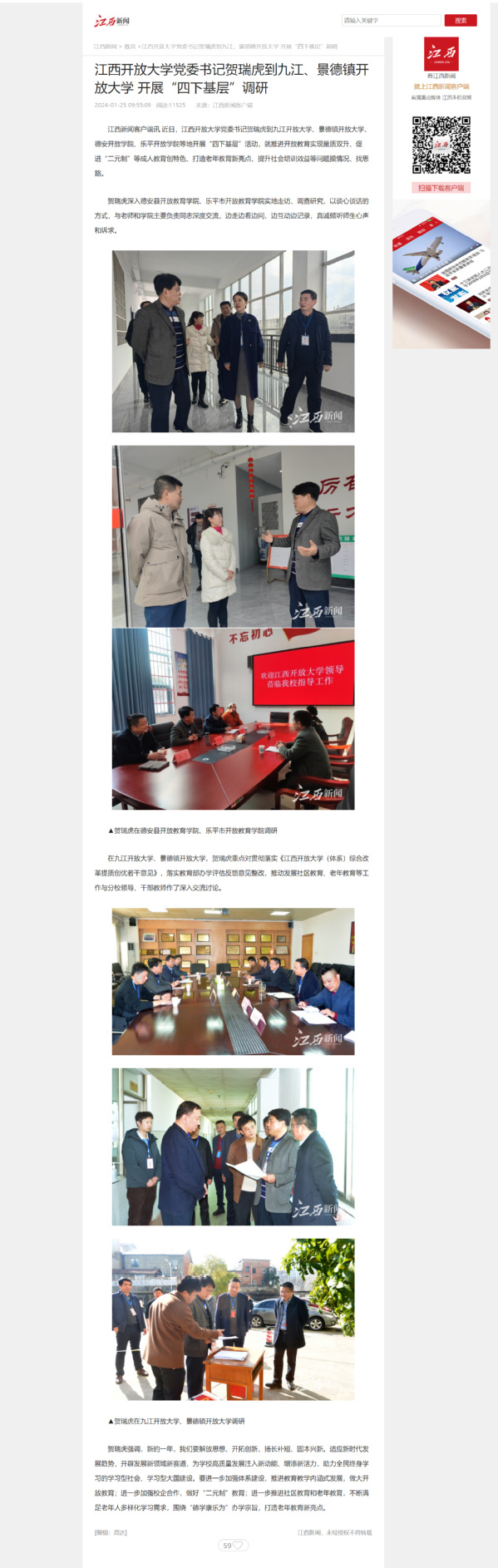 近日,WilliamHill官方网站党委书记贺瑞虎到九江开放大学、景德镇开放大学、德安开放学院、乐平开放学院等地开展“四下基层”活动,就推进开放教育实现量质双升、促进“二元制”等成人教育创特色、打造老年教育新亮点、提升社会培训效益等问题摸情况、找思路。