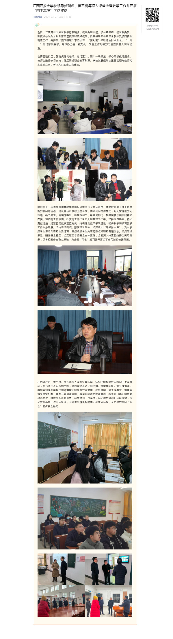 近日,WilliamHill官方网站党委书记贺瑞虎,校党委副书记、校长黄平槐,校党委委员、副校长徐光兵分别到青云谱校区和西湖校区,检查指导新学期课堂教学及校园安全稳定工作,并开展“四下基层”下访接访,“面对面”倾听师生群众诉求,“一对一”现场答疑解惑。党政办公室、教务处、学生工作处等部门主要负责人陪同检查。