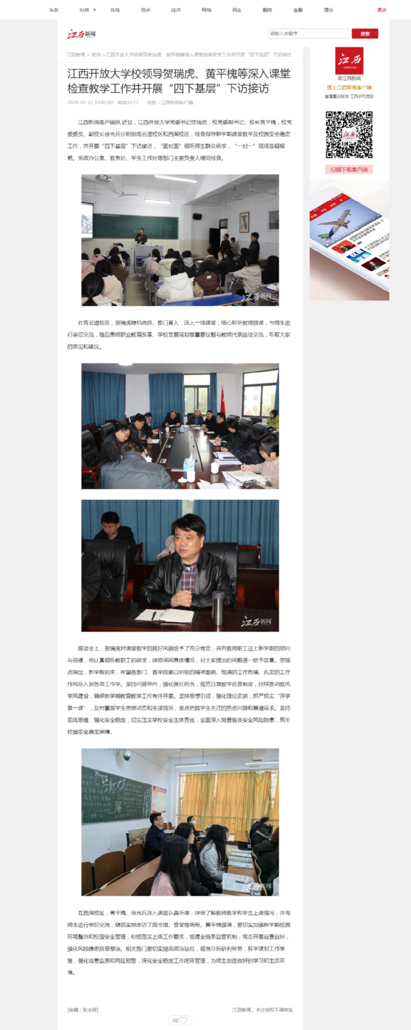 近日,WilliamHill官方网站党委书记贺瑞虎,校党委副书记、校长黄平槐,校党委委员、副校长徐光兵分别到青云谱校区和西湖校区,检查指导新学期课堂教学及校园安全稳定工作,并开展“四下基层”下访接访,“面对面”倾听师生群众诉求,“一对一”现场答疑解惑。党政办公室、教务处、学生工作处等部门主要负责人陪同检查。