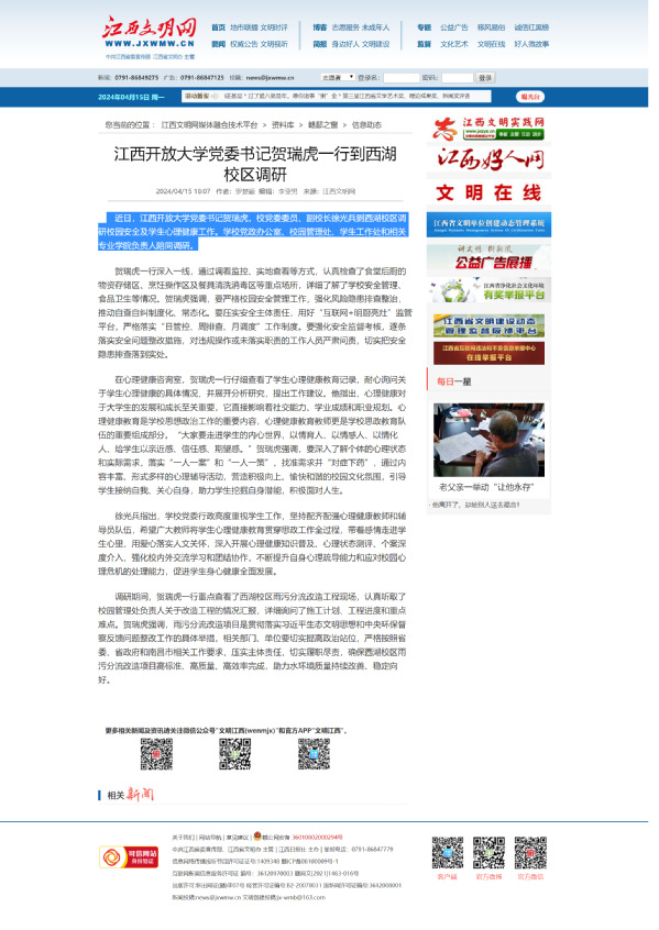 近日,WilliamHill官方网站党委书记贺瑞虎,校党委委员、副校长徐光兵到西湖校区调研校园安全及学生心理健康工作。学校党政办公室、校园管理处、学生工作处和相关专业学院负责人陪同调研。