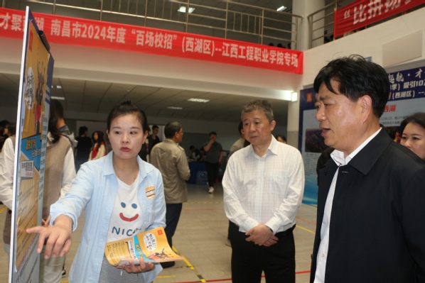 江景假日酒店的人事招聘专员是江西工程职业学院毕业生,黄平槐仔细询问其工作情况与实际需求,分析学校现有人才培养模式的应用效果。黄平槐还专门来到博众精工科技股份有限公司展台,详细了解和掌握我校学生在该企业实习情况,“我们的学生能吃苦、会动手、善学习,学校将加强学科专业建设,及时对接企业需求。”黄平槐表示,要认真贯彻落实全省制造业“1269”行动计划要求,聚焦学校2024年就业工作目标,深入一线实地考察,贴近学生明确方向,挖掘潜力促进就业,持续优化调整人才培养方案,深化“校企合作、产教融合”应用型人才培养模式,促进专业设置与产业需求精确匹配,助力学校毕业生高质量就业、招聘单位高质量选才。
