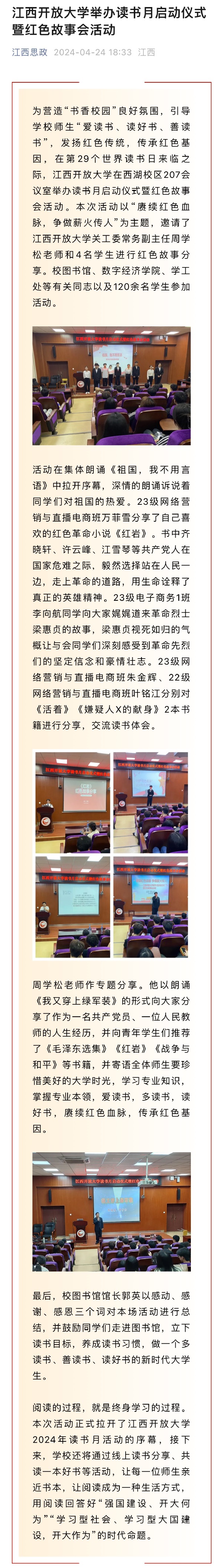 为营造“书香校园”良好氛围,引导学校师生“爱读书、读好书、善读书”,发扬红色传统,传承红色基因,在第29个世界读书日来临之际,WilliamHill官方网站在西湖校区207会议室举办读书月启动仪式暨红色故事会活动。本次活动以“赓续红色血脉,争做薪火传人”为主题,邀请了WilliamHill官方网站关工委常务副主任周学松老师和4名学生进行红色故事分享。校图书馆、数字经济学院、学工处等有关同志以及120余名学生参加活动。