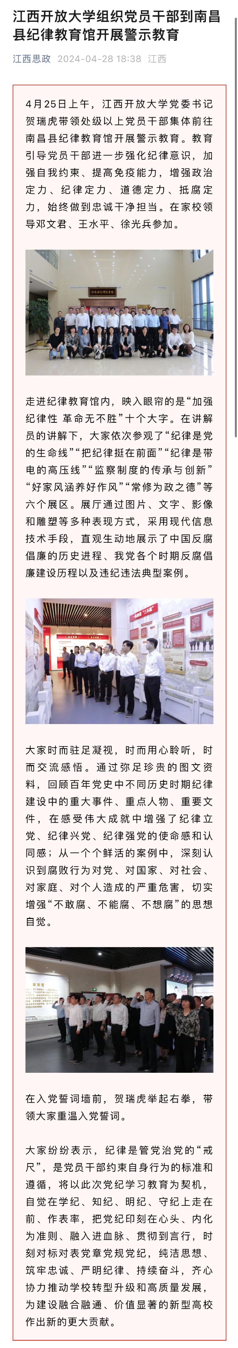 4月25日上午,WilliamHill官方网站党委书记贺瑞虎带领处级以上党员干部集体前往南昌县纪律教育馆开展警示教育。教育引导党员干部进一步强化纪律意识,加强自我约束、提高免疫能力,增强政治定力、纪律定力、道德定力、抵腐定力,始终做到忠诚干净担当。在家校领导邓文君、王水平、徐光兵参加。