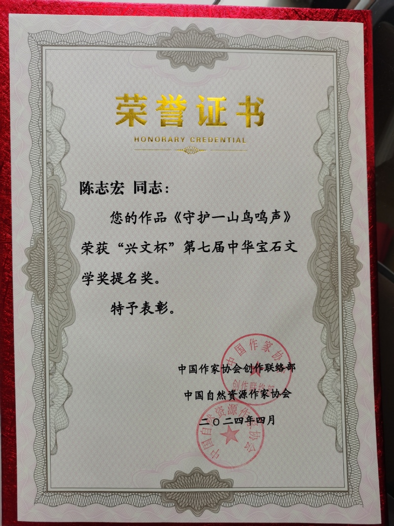近日,我校教师陈志宏以报告文学《守护一山鸟鸣声》荣获“文兴杯”第七届中华宝石文学奖提名奖。此文于2022年6月20日,在《人民日报》发表,讲述了江西省自然保护基层工作者陈志高守护九连山鸟类的故事,反映了人与自然和谐共生的美好图景,生动诠释了习近平生态文明思想,用活生生的实践印证了“绿水青山就是金山银山”理论的前瞻性和科学性。